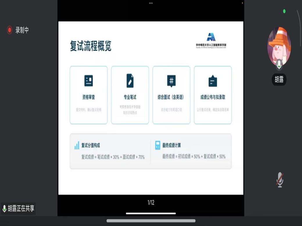 活动邀请了2025年考上研究生的付雪洋、胡露、夏宇俊三位优秀校友为正在备考的同学分享面试经验。活动中,付雪洋围绕复试备考全过程,从心态调整入手,强调将紧张转化为动力、拒绝内耗并聚焦行动,梳理了复试内容构成与权重,讲解了专业能力测试中的理论、技术及热点问题,并就外语听说测试的高频问答和自我介绍的四段式设计提供范例。胡露聚焦华中师范大学现代教育技术专业复试特点,梳理资格审查到成绩公布的完整流程,介绍笔试核心参考书目与复习方法,分享面试自我介绍要素、专业问答应对技巧及英语面试备考策略,同时给出心态调整与临场应变建议。夏宇俊结合自身考研经历,围绕上机环境熟悉、练习平台使用及常见题目类型进行讲解,并就面试中的英语自我介绍、专业问题及项目经历等方面分享应对技巧,同时通过复试分值换算和复录比分析,强调复试的“通过性考试”性质,鼓励大家稳住心态、自信应考。三位校友的分享内容详实、各有侧重,为在场同学提供了多角度的复试备考思路。