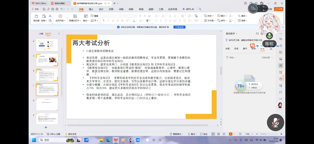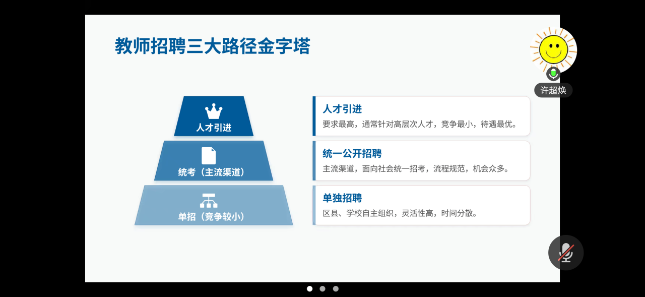 活动伊始,许超焕学长结合自身从备考到入职的亲身经历,带来干货满满的经验分享。他首先介绍了自己的工作待遇,然后详细拆解了教师招聘的三大路径:人才引进、统考以及单招,分析了统考和单招的差异和信息技术与通信技术的岗位竞争情况并给予建议,最后分享了实用的学习资源以及面试形式与要点。随后,陈杭学姐结合自身经历,微扰武汉市事业单位联考和湖北省教师招聘考试,介绍了考试内容、分值及侧重点等信息。并分享了相应的备考策略与建议。